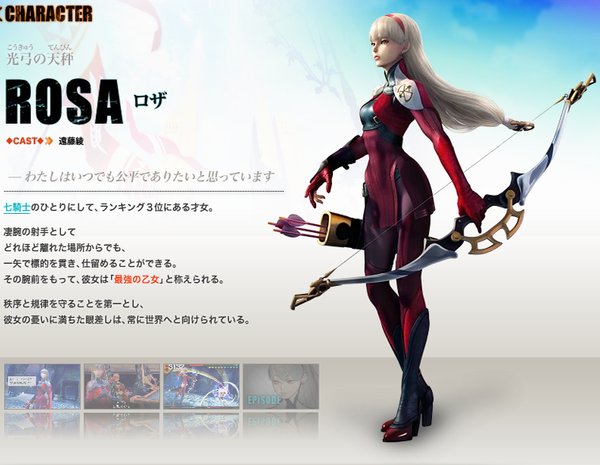 “七骑士”排名第三位的强大射手,人称“光弓天秤”。有着不论何种情况都能冷静地百步穿扬的射术,坊间也称其为“最强的少女”(另乙女亦有处女之意……不过我想这种情况下她很快会被同人作品破 处以供诸君意淫之的……所以只称其为少女)。性格上一丝不挂……啊……不是一丝不苟,崇尚秩序与纪律…类似学生会风纪委员长,办公室主任之类的角色……外形方面……除了矮了点其它都属于我的菜……