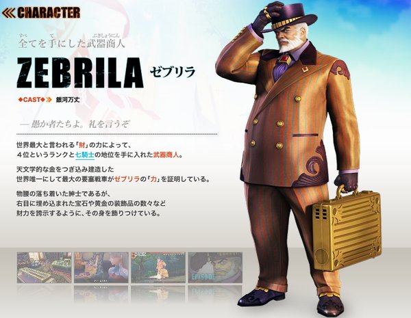 “七骑士”排名第四位的武器商人,世界首富…拥有投入天文数字的巨资而制作的世界唯一的超巨大要塞战车……说了很多个的……我休息一下……………………………………另外非常讲究衣着……还在自己的右眼中装饰了许多精淫猪宝……这种夸示自己财力的行为……已经不是我等正常人类可以理解得了的了。