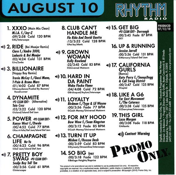 : 01. M.I.A. Ft. Jay-Z - XXXO (Main Mix Clean) 02:58 02. Ciara Ft. Andre 3000, Ludacris & Bei Maejor - Ride (Bei Maejor Remix) 04:24 03. Travie McCoy Ft. Gucci Mane, T-Pain & Bruno Mars - Billionaire (Nappy Boy Remix) 04:02 04. Taio Cruz - Dynamite (Promo Only Clean Edit Alternative) 03:22 05. Kanye West Ft. Dwele - Power (Promo Only Clean Edit) 04:52 06. Ne-Yo - Champagne Life 04:23 07. Soulja Boy Tell 'em - Pretty Boy Swag (Promo Only Clean Edit) 03:56 08. Flo Rida and David Guetta - Club Can't Handle Me 03:52 09. Kelly Rowland - Grown Woman 03:45 10. Waka Flocka Flame - Hard in Da Paint 04:08 11. Birdman Ft. Tyga & Lil Wayne - Loyalty 03:56 12. Bow Wow Ft. Sean Kingston - For My Hood 03:12 13. Mishon Ft. Roscoe Dash - Turn it Up 03:59 14. Iyaz - So Big 03:18 15. Dorrough - Get Big (Promo Only Clean Edit) 03:45 16. Jessica Jarrell - Up & Running 03:36 17. Katy Perry Ft. Snoop Dogg & Cali Swag District - California Gurls (Remix) 03:47 18. Far East Movement Ft. The Cataracs - Like A G6 03:38 19. Laza Morgan - This Girl 03:08