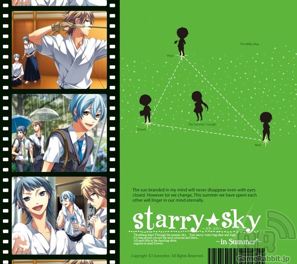 12星座の性格特徴を持つキャラクターが登場し、 ゲーム付きドラマCDと星座彼氏シリーズ[Starry☆Sky)] 。 ゲーム付きドラマCDはキャラクターたちと天体観測に行ってる気分になれるドラマCDと 各季節ごとに様々なテーマで展開するゲーム。 おまけのゲーム『Starry☆Sky~in Summer~』は 星座彼氏シリーズVol.5、Vol.11、Vol.12であなたの彼氏になる 金久保誉、宮地龍之介、木ノ瀬梓が登場して部活動を共にしながらあなたとの恋物語を紡ぎます。 星座彼氏シリーズであなたの彼氏になる彼らとの出会ってから恋に落ちるまでの物語をお楽しみください。 単品でも楽しめる内容になっておりますが星座彼氏シリーズとゲーム付きドラマCDを 両方合わせてお楽しみいただくとより一層Starry☆Skyの世界観が楽しめる作りになっています。