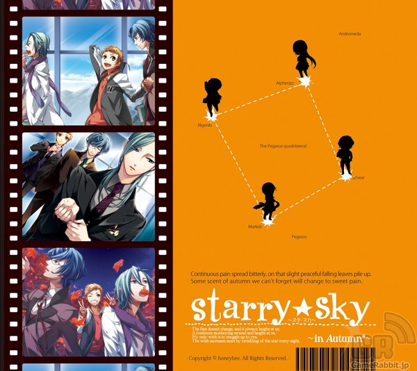Starry☆Skyは12星座の性格特徴を持つキャラクターが登場し、 ゲーム付きドラマCDと星座彼氏シリーズで展開する作品です。 ゲーム付きドラマCDはキャラクターたちと天体観測に行ってる気分になれるドラマCDと 各季節ごとに様々なテーマで展開するゲームとなっています。 おまけのゲーム『Starry☆Sky~in Autumn~』は 星座彼氏シリーズVol.6、Vol.8、Vol.10であなたの彼氏になる 水嶋郁、陽日直獅、星月琥太郎が登場して保健室を舞台にあなたとの恋物語を紡ぎます。 星座彼氏シリーズであなたの彼氏になる彼らとの出会ってから恋に落ちるまでの物語をお楽しみください。 単品でも楽しめる内容になっておりますが星座彼氏シリーズとゲーム付きドラマCDを 両方合わせてお楽しみいただくとより一層Starry☆Skyの世界観が楽しめる作りになっています。