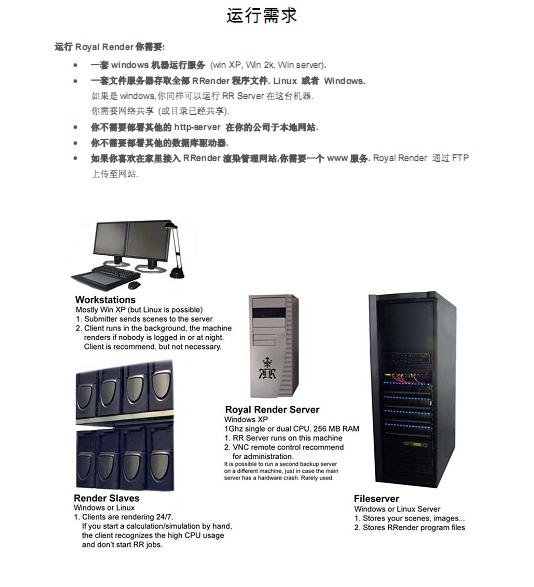 支持开放的渲染器-- Royal Render的服务器、递交工具与客户端大部分对渲染软件没有特别的要求,所有的任务都保存在一个很小的配置文件中。 如果你有新的渲染软件想加到Render Farm中,或者当前的渲染软件有了新的版本(比如改变了渲染指令),你只要写一个配置文件就可以渲染他们。在服务器、递交工具与客户端界面中仍然会有特定软件的设置信息,主要针对一些主流的渲染软件。当然,也可以通过插件来读取场景信息。