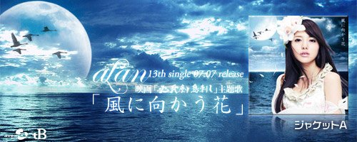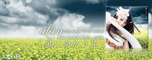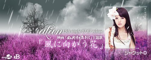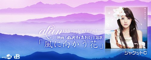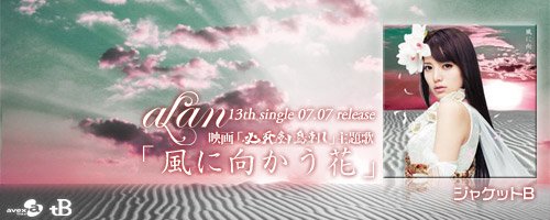 2010年7月7日,alan第13张单曲「風に向かう花」,以前所未有的姿态——5版本震撼发行。 如临画境的造型,绚烂的民族风,融入明亮华丽的藏音,打造出闪耀璀璨的兰声兰调。 7月7日,「風に向かう花」,在单调的色彩中,邂逅瑰丽的生命。 这首歌曲是7月10日公映的日本历史剑侠电影《必死剣鸟刺し》(《必死剑鸟刺》)的主题曲,C/W曲《ココニイル》是林志玲出演的广告《QUALITA》的主题曲,该广告于5月18日开始在电视上播出。官网也有30s的试听了,还有封面也放出来了,和宣传的图片,都很有爱啊。还有阿兰的第二场演唱会 alan 2nd concert「alan symphony 2010」 7.24号晚5点的那场票都售完了,肯定会比第一场更精彩的说,期待哇。 待望のalan 13thダブルタイアップシングル発売决定です! 7月10日公开、藤沢周平[隠し剣]シリーズ秀异の作を完全映画化した映画「必死剣鸟刺し」の主题歌です。 また、カップリングに収録される「ココニイル」は、 リン・チーリン出演のCM「QUALITA」CMイメージソング!5/18~OA开始です! 2010.07.07 release 「風に向かう花」 / 映画「必死剣鸟刺し」主题歌 c/w「ココニイル」 / 「QUALITA」CMイメージソング 今作品はコンテンツ豊富な5形态。 ジャケットA(CD+DVD)ではリード曲「風に向かう花」のMusic Videoとメイキング、 ジャケットB(CD+DVD)では今年1月24日东京・人见记念讲堂にて行われた1st concertからライブ音源と 当日一日の密着舞台裏、ジャケットC(CD only)では日本の名曲「いい日旅立ち」のカバーを収録! mu-mo shop限定盘となるジャケットD(CD+DVD)では「Nobody knows but me」「my life」 の中国语セルフカバー+中国语中国でリリースされたアルバム「兰色~love moon light~」から2曲のMusic Videoとメイキング、 初の试みとなるジャケットE(CD only)では、7月に行われる2nd concertのチケット付CD! 是非お楽しみに!