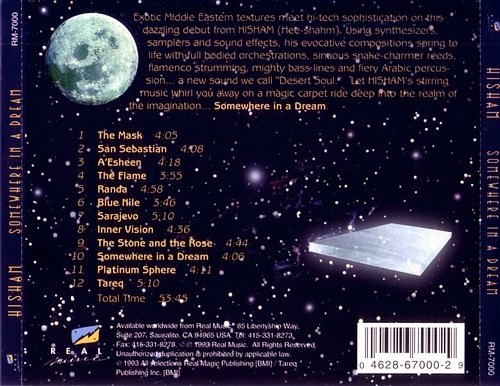 《Somewhere In A Dream》是 Hisham 希沙姆 于1993年与著名的新世纪电子音乐家 Mars Lasar 一起合作,推出的首张专辑。充满异国情调的中东风格令人眼花缭乱。特别是 Mars Lasar 所表现出的高超的制作水准,更具有一定的复杂性。弗拉门戈吉他、强大的低音线条和火热的阿拉伯语打击乐,焕发出春天的蓬勃生机。如果你是火星人 Mars Lasar 的乐迷,一定不要错过这张专辑!