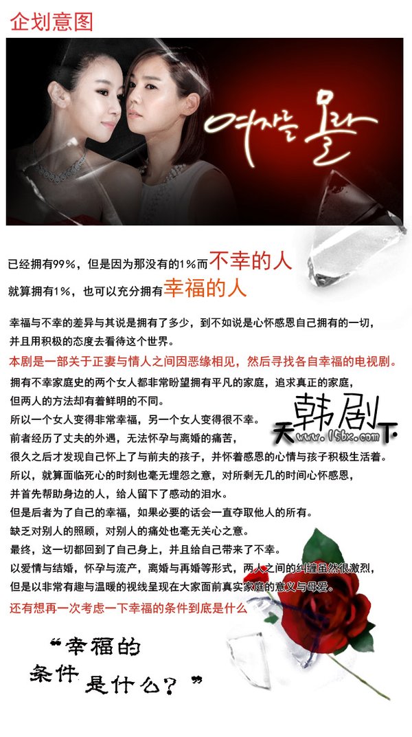 《不懂女人》讲述的是正妻和勾引丈夫的女人因孽缘而见面的两个女人寻找幸福的故事