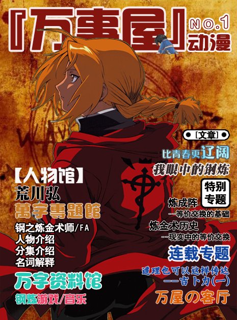 经过为期近二十天的准备,筹划,以及制作,『万事屋』动漫第一期终于与大家见面了。 同样首先感谢参与制作的朋友们,没有他们,也不会有它的诞生。感谢支持,期待这本刊物 的人们,有你们的支持和鼓励,我们才能有动力将其做出来。 这期是《钢之炼金术师》主题刊物,就如再零期提到的,我们的制作方向,是以每期一 个动漫主题为主的形式制作。作为第一期,也是重要的一期,我们把这重任交给了爱德华兄 弟。希望能借由他们那不屈不挠的精神,带领我们坚持着走下去。 这期的制作,真的得到了不少帮助,因为他们的加入,我们有了自己的LOGO,自己的文 章,自己的风格,自己的很多很多。俗话说,万事开头难,虽然我们刚刚起步,虽然第一期 会有这样那样的不足,但是我们还是秉着只要努力,就回见到成功的信念,去完成了这期。 也希望你能喜欢他。