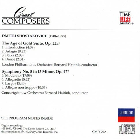 : Disc 1 1/2 The Age of Gold Suite, Op. 22a 01. Introduction 02. Adagio 03. Polka 04. Dance London Philharmonic Orchestra; Bernard Haitink, conductor Symphony No. 5 in D Minor, Op. 47 05. Moderato 06. Allegretto 07. Largo 08. Allegro non troppo Concertgebouw Orchestra; Bernard Haitink, conductor Disc 2 2/2 Cello Concerto No. 1 in E Flat, Op. 107 01. Allegretto 02. Moderato 03. Cadenza 04. Allegro con moto Lynn Harrell, cello; Concertgebouw Orchestra; Bernard Haitink, conductor Sonata for Cello and Piano in D Minor, Op. 40 05. Allegro non troppo 06. Allegro 07. Largo 08. Allegro Lynn Harrell, cello; Viadimir Ashkenazy, piano String Quartet No. 8 in C Minor, Op. 110 09. Largo 10. Allegro molto 11. Allegretto 12. Largo 13. Largo Fizwilliam String Quartet