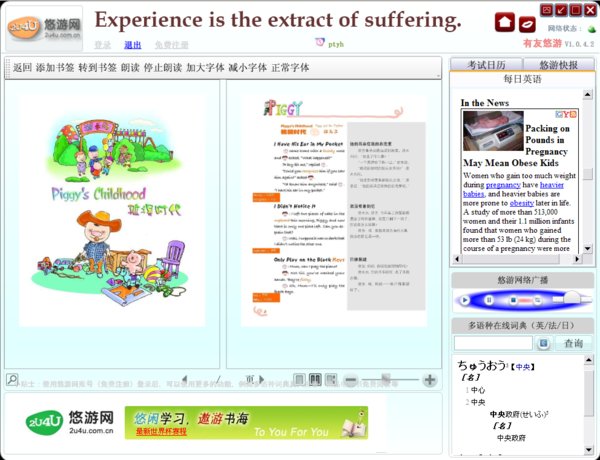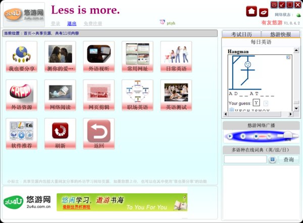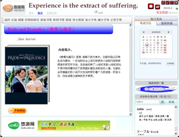 外语学习网站悠游网的外语学习客户端软件,这是内测版,可以免费阅读悠游网的大量资源,还带有外语考试(雅思、托福、GRE等)日历提醒、外语广播电台(好像还有相声)、英法日多语种词典、每日英语资料、双语电子书阅读、常用网址、网络外语学习资源(音视频)汇集聚合功能,外语学习者适用。还有一些小功能,如手机、IP地址归属地查询、支持朗读小说等等。安装需要微软.Net Framework 3.5 SP1,如果之前没安装过安装程序会自动从微软网站下载安装,如果嫌慢,可以从微软网站或者通过360等软件预先下载安装。大部分有用的功能需要注册一个用户,但均免费。
