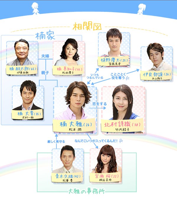 剧中,松本润扮演一名父亲是大牌演员楠航太郎的二三流演员楠大雅,从小就生活在父亲的光环之下,被人叫做「楠航太郎的儿子」,性格顽固内心却有自己的想法。虽然和父亲同样选择演员这条道路,但完全接不到戏,平时只能接到作为「二代俳优」上上综艺节目。 某日为了散心,和同样是二代俳优的庆太一起去跳伞时,因降落伞的控制系统出现问题,最后落在一片森林中的一棵大树上悬空。这时,楠大雅偶遇竹内结子扮演的年上美女诗织,并对她一见鐘情……由此生出一段让人心跳不已的夏日爱情故事。