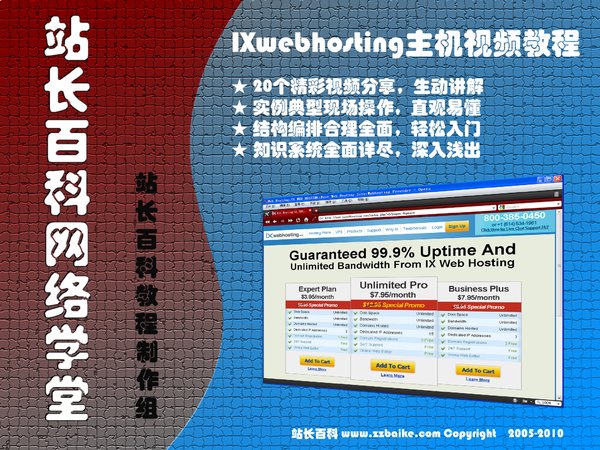 国外主机的优势每个使用者都深有体会,但是语言的障碍和复杂的操作往往让站长和爱好者们望而却步,站长百科免费推出的系列教程将为大家解决困难,让您轻松上手,将精力更多的放在开发和构思。 Ixwebhosting小带宽版系列教程共20集,视频压缩达到极限,全心全意为您的带宽考虑。本版视频教程从Ixwebhosting控制面板,域名相关,FTP,Webshell,实例安装,邮箱,工具,主机账户等方面做了详细的介绍。站长百科网络学堂会继续发布Ixwebhosting视频教程的高清版,为追求视频质量的人服务。 这里是第一集,有需要的童鞋们可以先预览下 http://www.tudou.com/l/rPknkIzABTA 如果您在任何主机方面有需要了解或希望制作成视频教程,请您登录站长百科视频教程组提出您的想法,我们会为大家提供最大的方便。 上一期发布了[小带宽福音版],有些驴友反映看习惯了高清,看教程有点抓狂,总感觉近视度数又有加深了,所以应驴友要求,推出IXwebhosting中文主机清晰版教程,希望大家继续多多支持,Ixwebhosting大带宽版系列教程共20集,视频清晰度佳,全心全意为您的眼睛考虑。 提供个IXwebhositng中文站官网地址,方便大家。 同时,大家的热情下载给我们很大动力,我们将陆续推出其它国外主机商相关视频教程,欢迎大家随时关注站长百科视频教程组,我们会尽最大的努力满足大家的需求。