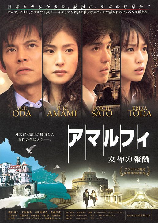 在圣诞节前夕的罗马,一个男子踏上了这片土地,他是日本外交官黑田康介(织田裕二饰)。由于接到了恐怖份子的预告函,上司片冈(中井贵一饰)派黑田前往意大利,保护在意日本国民的安全。 黑田来到了日本大使馆。菊原大使(小野寺昭饰)、西野参事官(佐野史郎饰)、外交官羽场(大塚宁宁饰)和谷本(伊藤淳史饰)等人正忙着准备川越外务大臣(平田满饰)访意参加八国会议的事宜。与此同时,一个普通的日本女孩在流光溢彩的城市里突然失踪。这是单纯为求赎金的绑架案?还是恐怖事件的序幕? 黑田和刚到大使馆工作不久的实习生安达(户田惠梨香饰)一起为受害人当翻译。绑匪给女孩的母亲纱江子(天海祐希饰)打来了电话,黑田为情势所逼只得假冒纱江子的丈夫。在意大利,私自向绑匪支付赎金是违法行为。两人也顾不了这些,匆匆根据绑匪的指示前往游人如织的中央火车站、圣天使堡和西班牙广场进行交易。然而由于警方的突然介入,绑匪中止了交易。 意大利充满了对亡夫的回忆,而心爱的女儿竟在这里遭到绑架,纱江子伤心欲绝。意大利警方以逮捕犯人为先,并不把女孩的安全放在首位。黑田尽力与他们沟通,但心力憔悴的纱江子渐渐对黑田也产生了不信任感。倾心于纱江子的藤井(佐藤浩市饰)获悉后从伦敦赶来。在他的安慰下,纱江子终于镇静了下来。 面对狡猾的犯人,警方束手无策。黑田决定自行展开调查,在老朋友自由作家佐伯(福山雅治饰)的帮助下,他查出了一些眉目。不过由于外交官并无调查权限,意大利内务省对这种越权行为提出了抗议。黑田坚持比守规矩,保护国人才是自己工作,他在大使馆遭到了孤立。而少女绑架事件很快升级,意大利总统、八国首脑们、甚至莎拉•布莱曼也卷了进来,意大利面临着全国性大规模连锁恐怖事件的威胁。 掌握了关键线索的黑田赶赴意大利南部的美丽海边小城阿马尔菲,他能找到真相阻止惨剧的发生么?! 幕后制作 富士台50周年纪念 全意大利摄制悬疑大片 富士台可算是日本众多民营电视台中最牛的一个,且不说连续剧经常占据收率第一,甚至在电影界也是首屈一指的大腕。日本最卖座的真人本土电影《跳跃大搜查线 2 封锁彩虹桥》就是富士台的大作,它所缔造的173亿5千万日元票房神话至今高悬难及,能达到这一成绩的一半就已经算是顶级卖座片了。除此之外,从上世纪八十年代的《南极物语》、《小猫的故事》,到近年的《海猿2:爱之界限》、《律政英雄》这些排在历年票房榜前列的大热之作都是富士台的作品。 今年正值富士电视台建台五十周年,一部前所未有的豪华大片——《阿马尔菲:女神的报酬》作为纪念特别电影横空出世。 虽然没有透露具体数字,但富士台明言该片是有史以来投资最大的电影。影片集结了台内的顶尖人物,制作人由富士台负责电影事务的龟山千广出任,主持策划的则是电视剧方面的金牌制作人大多亮。大多亮并没有采取时下流行的改编现场畅销小说漫画、拍热门电视剧续集的讨巧手段,而是策划了一部原创电影,在题材方面则选定为最容易获得观众青睐的悬疑故事。他邀得名作家真保裕一加盟,专门为新片构思剧情。真保十分擅长撰写场面宏大、具有悬疑气氛的作品,他的小说《雪茫危机》曾被搬上银幕并大获成功,成为名噪一时的日本国产大片。出任本片导演的也是富士台的自家人——西谷弘,他不仅导过《白色巨塔》、《救命病栋 24小时》、《神探伽利略》等名电视剧,所执导的两部电影《县厅之星》和《嫌疑犯X的献身》也都取得了票房佳绩。 《阿马尔菲:女神的报酬》最奢华之处在于全部在意大利摄制。影片的外景地遍及罗马历史中心区、卡塞尔塔皇宫、阿马尔菲海岸三大世界遗产,众多名胜古迹都成了主人公们活跃的舞台,此外梵蒂冈也作为背景多次在片中出现。更为离谱的是,影片就连搭设布景的室内戏竟然也都是在意大利的摄影棚中拍的。富士台真可谓是下足了血本。而全意大利拍摄并不仅仅是个便于宣传的镀金标签,演职人员们在异国整整三个月的奔波辛劳为影片带来了壮阔的美景和独特的氛围。 青岛变黑田 织田裕二挑战外交官角色 在新片计划初具雏形之时,富士台就决定由织田裕二来担当影片的主演。缔造跳跃大搜查线神话的主要功臣之一织田裕二一直是备受富士台青睐的明星演员,纵然在《椿三十郎》票房失利、《太阳与海的教室》收视率惨淡等一系列“失手”之后,他依然是富士台的一员爱将。 有意思的是,出于制作方的“大搜情结”本片主人公外交官黑田康作的名字也是由《大搜》主角青岛俊作化出来的,从选字上就能看出其中的亲缘关系。和喜欢憨笑的青岛不同,本片中的黑田外交官是个不苟言笑的人,他也不像年轻热血的青岛那么有棱角。不过,他和青岛一样是个有着执着的信念的人,并且为了贯彻信念不惜做个组织机构中的异类。 为了塑造黑田这个角色,织田裕二花了很大的功夫,甚至连眼神、小道具等细节都做了充分的考虑。为了掌握台词,他利用一切空隙时间苦练意大利语,从一个只知道“Pasta”的人成了能流利对话意大利语熟手。而西谷导演偶尔的突发奇想也让织田遭了不少罪。来到西班牙广场后,西谷突然加了剧本上没有的一个场面 ——让黑田差点被汽车压到。织田本以为会叫替身,不料导演要他直接亲自上阵。所幸一切