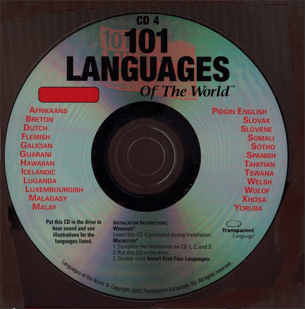 Disc4:南非荷兰语,布列塔尼语,荷兰语,佛兰德语,加利西亚语,瓜拉尼语,夏威语,冰岛语,卢干达语,卢森堡语,马达加斯加语,马来语,洋泾浜英语,斯洛伐克语,斯洛文尼亚语,索马里语,索托语,西班牙语,塔希提语,茨瓦纳语,威尔士语,沃洛夫语,科萨语,约鲁巴语。