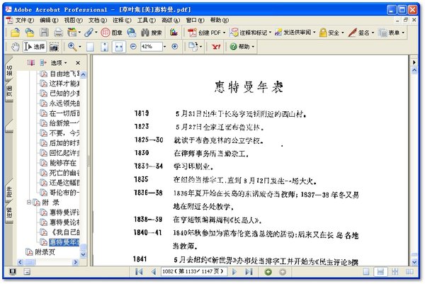 : 卷首题诗 铭 文 我歌唱“自己” 我默默沉思 在海上备有舱位的船只里 给外邦 给一个历史学家 给你,古老的事业 事物的真象 我为他歌唱 在我读这本书的时候 我开始了学习 初学者 对各州 州际旅行 给某一女歌唱家 我沉着冷静 学者风度 船儿在启航 我听见美利坚在歌唱 是什么地方受到了包围? 虽然我还是歌唱这一个 不要向我关闭大门 未来的诗人 给你 你,读者啊! 从鲍玛诺克开始 我自己的歌 亚当的子孙 世界登上了花园 来自受抑制的如饥似渴的河流 我歌唱那带电的肉体 一个女人在等着我 顺从天性的我 把一小时都献给疯狂与欢乐 从滚滚的人海中 多少年代以后还会不时地回来 我俩,我们被愚弄了这么久 处女膜啊!啊,有着处女膜的人! 我就是那渴望爱情者 顺乎天性的时刻 一次,我经过一个人烟稠密的城市 我听见了你,庄严甜蜜的管风琴 从加利福尼亚海岸朝西看 亚当一清早 芦 笛 在人迹罕到的小路上 我胸口的芳草 现在紧紧缠着我的不管是谁 为了你,啊,民主! 我在春天唱着这些歌 不只是我胸腔里呼出的气 关于极度可疑的表面现象 一切形而上学的基础 今后多少年代的记事员 在一天将结束时我听说 你就是那被我吸引的新来的人吗? 只是些根与叶 不是高温点燃起火焰并烧毁一切 缓缓渗出的点滴 纵情欢乐的城市 看这张黝黑的脸 在路易斯安那我看见一株四季常青的橡树在成长着 给一个陌生人 这一瞬间既深切怀念又心事重重 我听见人们指责我 在大草原的草丛中劈路而行 在我读到那已经取得战果的美名时 我们两个少年紧紧搂抱在一起 给加利福尼亚许下一个愿 这里是我最脆弱的草叶 不是一架节省劳力的机器 一瞥 给携手者的一片草叶 大地和我很形似 我在梦中梦见 你知道我为什么手里拿着笔? 给东部和西部 有时对我所爱的那个人 给一个西部的少年 让抛下的锚永远固定下来,啊,亲爱的! 在许多许多人之间 啊,我经常悄悄地来到你身旁 那影子是我的肖像 现在还充满活力 向世界致敬! 大路歌 一路摆过布鲁克林渡口 回答问题者之歌 我们熟悉的一簇簇叶子 欢乐之歌 阔斧歌 展览会之歌 红杉树之歌 职业之歌 转动着的大地之歌 青年,白天,老年和夜 候 鸟 普遍性之歌 拓荒者!啊,拓荒者! 给你 法兰西(合众国的第十八个年头) 我自己和我的一切 流星的年代(1859—1860) 先行者 百老汇大街上的盛大游行 海 流 来自不停摆动着的摇篮那里 在我随着生活的海洋落潮时 泪水 致军舰鸟 在船上的舵轮旁 黑夜,在海滩上 海底世界 黑夜,独自在海滩上 歌唱所有海域,所有船只 在巴尼加特海湾巡逻 紧跟着海船 在路边 一首波士顿民谣(1854) 欧罗巴(合众国的第七十二年和第七十三年) 一面小镜子 上帝 胚芽 有感 在我聆听那博学的天文学家讲学时 至美至善 啊,天!啊,生活! 给总统 我坐而眺望 致慷慨的施舍者 鹰的嬉戏 思想在漫步 一幅农家图画 一个孩子的惊奇 赛跑的人 美丽的女人 母亲和婴儿 有感 戴着假面具 有感 滑翔在一切之上 你从来没有遇到过这样的时刻吗? 一个思想 给老年 地点与时间 礼物 致这个国家(以说明第十六届、十七届,或十八届总统的在职 时期) 鼓声哒哒 诗歌啊,首先是一首前奏曲 一八六一 敲吧!敲吧!鼓啊! 从鲍玛诺克开始我就像鸟儿那样飞翔 黎明时的旗帜之歌 啊,时代,从你们那无底深渊中脱身出来吧 弗吉尼亚——西部 船的城市 百岁老人的故事 骑兵越津而过 在山腰宿营 军团在行进中 在野营的时明时灭的火光旁 从地里上来吧,父亲 一天晚上,我在战场上站了一班奇异的岗 列队急行军 在黎明的灰暗光照下扎营地所见 我艰难地在弗吉尼亚的树林里漫步的时候 不是领航员 在我身边战栗而旋转的那一年 裹伤者 太久太久了,美利坚 给我那光彩夺目的沉默的太阳 两个老兵的哀歌 在成堆的尸体上空升起了预言家的声音 我看见老将在作困兽斗 炮手在梦幻中所见 埃塞俄比亚在向军旗敬礼 青春不属于我 是老兵那种人 世界,请好好注意 啊,晒黑了脸的草原那边来的孩子 请往下看,美丽的月亮 和解 一个一个地够多么庄重 我把头枕在你怀里时,伙伴啊 幽雅的群星 给某个平民 看哪,山巅的胜利女神 已完成任务的精灵 向一个士兵告别 转过脸来吧,啊,自由! 向着他们走过的已经发酵的土地 纪念林肯总统 最近紫丁香在前院开放的时候 啊,船长!我的船长! 今日宿营地静悄悄 这一撮尘土曾经是一个人 在蓝色的安大略湖畔 走向反面 秋天的溪流 作为由此而造成的结果 英雄们的归来 有那么一个孩子出得门来 古老的爱尔兰 城里的停尸所 这堆粪肥 给一个遭到挫败的欧洲革命者 未曾被题名的国家 谨慎之歌 狱中的歌手 丁香花开放时的欢唱 一座坟墓的草图 从这个假面背后 发声艺术 致那个钉在十字架上的人 你们这些在法院受审判的重罪犯 创造的法则 给一个普通妓女 我在长时间寻找 有感 奇迹 转轮发出的火花 给一个学生 把折迭打开 我还能是什么 宇宙 别人可以任意赞扬 谁能学完我这一节课? 考试 火把 啊,法兰西之星(1870—1871) 驯牛人 一个老年人思考中的学校 清晨漫步 达科他的意大利音乐 你得天独厚 我的画廊 大草原的诸州 风暴的豪迈音乐 向着印度行进 哥伦布的祈祷 睡觉的人们 变位 想一想时间 神圣的死亡的低语 你现在有胆量吗,啊,灵魂? 神圣的死亡的低语 歌唱神圣的四方 我日夜爱着的他 然而,然而,你们这些懊丧的时