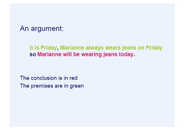 那么﹐当我们在日常生活中听到或看到一个推理时﹐我们就练习将它转换成论证形式﹐寻找它的前提与结论﹐然后可以更进一步的去分析它。但是﹐有时我们很难在一个日常生活的推理中找到结论是什么﹐或甚至找到好几个没什么关连的结论。有许多人的思考非常混乱﹐很难将其推理清楚的整理出来﹐这时﹐我们需要一些技巧﹐例如﹐通常结论出现在某些特别的词汇后面﹐像是﹐「因此」、「所以」、「那么」等等﹐或者出现在另外一些词之前﹐像是﹐「…﹐因为」或是「…,否则」等等。这些词汇都属於推理性用语﹐我们可以从这些关键词中寻找结论以及前提。
