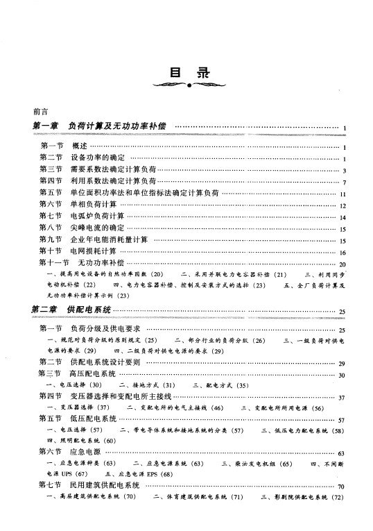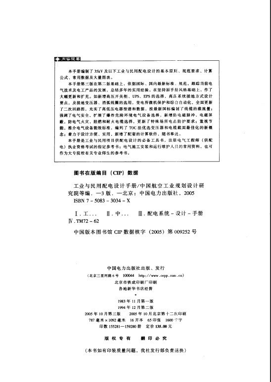本手册是在总结《工厂配电设计手册》使用经验的基础上,增加了35kV和民用建筑配电设计有关内容后,重新编写的。其内容反映了即将颁发的我国电气设计技术规范的有关规定,做到了内容与规范衔接同步。主要内容包括:负荷计算和无功补偿,供配电系统,变配电所的设计,短路电流计算,高压电器的选择,电能质量的提高,继电保护和自动装置,二次接线,电线电缆选择,线路敷设,低压配电线路保护和低压电器选择,常用用电设备配电,防雷和接地,低压电气装置的防电击保护和特殊环境内(如医院内使用作心脏内手术的医疗电气设备的场所)的电气安全等。