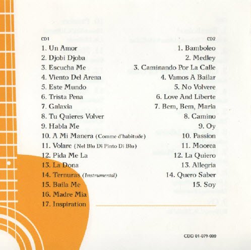 : CD 1 1/2 01. Un Amor 02. Djobi Djoba 03. Escucha Me 04. Viento del Arena 05. Este Mundo 06. Trista Pena 07. Galaxia 08. Tu Quieres Volver 09. Habla Me 10. A Mi Manera (Comme D’Habitude) 11. Volare (Nel Blu Dipinto Di Blu) 12. Pida Me La 13. La Dona 14. Ternuras (Instrumental) 15. Baila Me 16. Madre Mia 17. Inspiration CD 2 2/2 01. Bamboleo 02. Medley 03. Caminando Por La Calle 04. Vamos A Bailar 05. No Vivire 06. Love And Liberte 07. Bem, Bem, Maria 08. Camino 09. Oy 10. Passion 11. Moorea 12. La Quiero 13. Allegria 14. Quiero Saber 15. Soy
