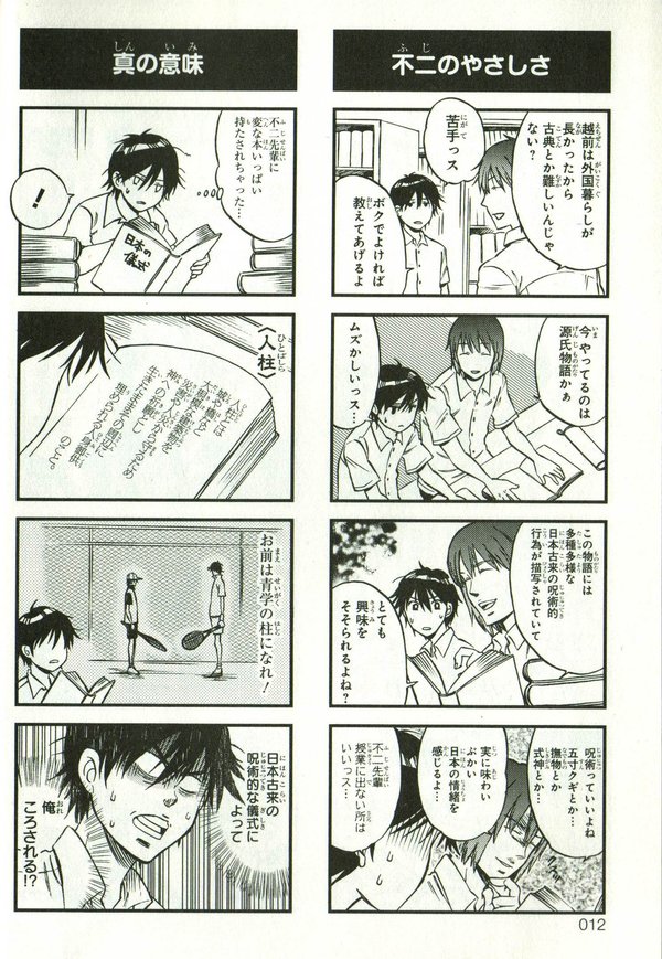 原作者监修的……同人(?)。 描述王子们在不对战网球时的日常生活。在这里可以看到其实非常罗嗦的手冢,果然很腹黑的不二,意外温柔的观月,处处得罪人的立海队长(幸村,你……真的很KY…) 等等。没有了网球场上的硝烟弥漫(真的很多烟雾啊…),卸下装酷的造型和耍帅的对白,从另一个角度看,王子们的日常生活也许真的是如此鸡毛蒜皮。
