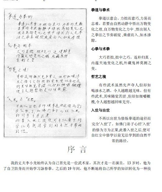 本书是在李小龙逝世后由其遗孀琳达女士与武术理论作家吉尔伯特强生合作,根据李小龙生前武学与哲学笔记手稿整理而成,并由李小龙截拳道大弟子伊诺山度审订。 该书208页,大16开,囊括了李小龙生平武学与哲学理论的精华,并收录了大量李小龙的武学笔记手稿,出版后立即风靡东西方,被译成九种文字畅销世界各地,迄今为止已印刷四十余次,被西方武术界奉为“武术圣经”。 李小龙生前本打算将这部书的手稿命名为“武道释义”,1975年该书出版时由琳达女士定名为《截拳道之道》,而将全书的开篇--哲学理论部分配发李小龙“武道释义”手迹与题图,以示缅怀。书中详论了截拳道的技术体系,攻击防守原则与武术哲学之终极目的。香港曾出版有该书的中文译本《李小龙--截拳道》(译者:杜子心),影响广泛。 以下为截图: