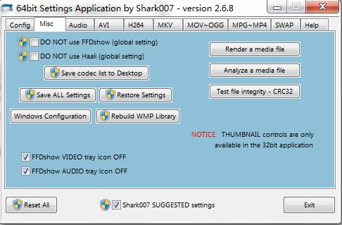 2.在“Misc”选项卡下勾选“Shark007 SUGGESTED settings”即可将Windows Media Player关联到所有支持的视频格式。勾选“*** icon OFF”取消播放音视频时任务栏中解码器图标的显示。