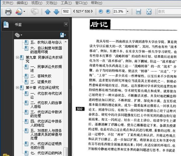 : 第一章 民事诉讼基本模式的比较分析/1 一、 民事诉讼基本模式的概念和意义/3 二、 民事诉讼基本模式的两大类型及划分根据/8 三、 两种民事诉讼基本模式的历史分析/22 四、 两大法系民事诉讼制度的发展与民事诉讼 基本模式的变化/56 五、两大法系民事诉讼基本模式差异的观念 分析/78 第二章 我国民事诉讼基本模式透视与转换/87 一、我国民事诉讼模式属性分析/88 二、职权主义诉讼模式的结构性缺陷透视/100 三、民事审判方式改革与诉讼模式的转换/108 四、 关于民事诉讼基本模式选择的几个 问题/121 五、 民事诉讼模式转换与民事诉讼制度的调整/138 六、 民事诉讼基本模式的转换与民事审判观念和理 论的整合/146 第 三 章 辩论主义的基本构成与法理/151 一、 辩论主义的基本含义/153 二、 辩论主义的根据/158 三、辩论主义的具体适用/164 四、真实义务与辩论主义/172 五、主要事实与间接事实/176 六、法律观点的指出义务与辩论主义/181 七、释明权与辩论主义/184 八、 关于辩论主义的重要判例/192 九、辩论主义的走向分析/195 第 四 章 诉讼标的及识别根据/201 一、 问题的提出 /202 二、 诉讼标的概念的基本含义/206 三、 传统的诉讼标的理论/211 四、 新诉讼标的理论的产生/215 五、 德国对新诉讼标的理论的修正/217 六、 日本的诉讼标的理论/220 七、 新实体法学说/228 八、 诉讼标的理论研究的现状/233 九、 我国诉讼标的制度的构想/237 第 五 章 证明责任的概念/243 一、 引子/244 二、证明责任的含义/246 三、苏联诉讼理论中的证明责任/255 四、我国民事诉讼理论中的证明责任/259 五、 证明责任的转换/264 六、 推定与证明责任/265 七、证明责任与自由心证原则/271 八、证明责任规范的法律性质/275 第 六 章 证明责任的分配/277 一、罗马法中的证明责任分配原则/278 二、德国民法典制定前后的证明责任分配学说/280 三、规范说及批判/288 四、证明责任分配新说/296 五、我国证明责任分配的理论和实践/305 第 七 章 集团诉讼的结构与法理/315 一、 集团诉讼的历史发展/316 二、 集团诉讼的现状/321 三、 集团诉讼的基本特征/333 四、 集团诉讼适用要件分析/340 五、 集团诉讼制度中集团成员权利保障的程序规定/348 六、 集团诉讼的功能评价/349 七、 集团诉讼与他国多数人诉讼制度的比较/353 八、 集团诉讼若干问题的探讨/370 附录一 《美国联邦民事诉讼规则》第23条/380 附录二 日本关于集团诉讼的民间法案/388 第 八 章 自认制度构成的理论分析/411 一、自认的基本含义/413 二、 自认成立的法律要件/418 三、对间接事实的自认/423 四、自认的撤回/426 五、权利认诺与自认/429 六、自认制度与我国的适用环境/435 第 九 章 民事诉讼失权研究/439 一、民事诉讼失权概述/440 二、答辩失权/445 三、证据失权/453 第 十 章 代位诉讼研究/461 一、代位权与代位诉讼/462 二、代位权人的当事人适格/468 三、代位诉讼中数诉的处理/473 四、代位诉讼中债务人的地位/477 五、对债权人与债务人法律关系的审查与处理/481 六、代位诉讼证明责任的分担/484 七、代位诉讼的判决/488 参考书目/494 后记/502