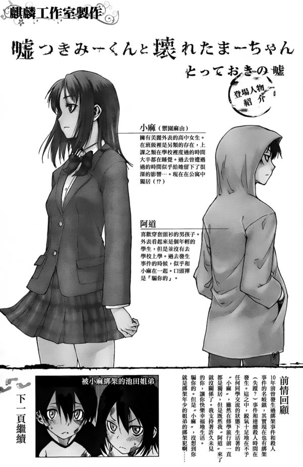 10年前,一对男女小学生被恶徒绑架,历经整整1年的暴行蹂躏最终获得解救。10年后今天,神秘杀人魔和绑架犯再度流传市井。痛苦的经历造就了扭曲变态的爱恋。一段凄美坏掉的感情,一句饱含热泪无奈的谎言,一份难以割舍的执着。2011年电视剧化预热,“黑暗系”小说的回归。由角川新人赏第二名佐藤敦纪执笔,改编自入间人间热销小说的《说谎的男孩与坏掉的女孩》在YOUNG ACE呈现。“我最XX小麻了,骗你的…”,未知加谎言的恋情,究竟要扭曲到何时……