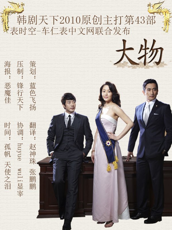 】:《大物》根据韩国著名漫画家朴仁权的同名漫画改编,讲述了围绕韩国第一位女总统发生的故事。剧中,高贤廷饰演的徐惠林是一位与社会恶势力势不两立的检察官,但由於拘留一位政治暴力组织幕后人物而被迫辞职,此后,她成为一名律师,并作为人权辩护律师打响自己的名字,随后她参加总统竞选,并在不懈努力下成为一名总统。 【剧中人物】: