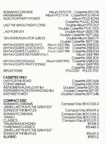 1983,詹姆斯精选披头士乐队历年冠军歌曲重新编配和演绎,注入清新华丽、浪漫迷人的音乐无素,在这一专辑中,我们一样能欣赏到披头士乐队的灵魂和精髓,还加上了独特的美妙的詹姆斯.拉斯特风味,可谓相得益彰,醇厚迷人,实在是乐迷们不容错过的专辑。