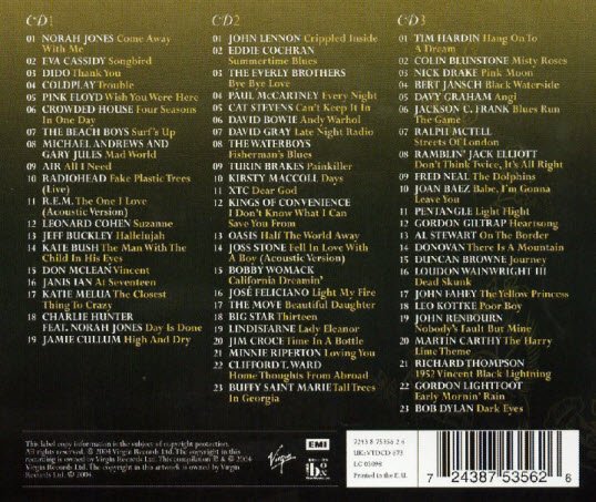 原声歌集 3张CD共收集了65首一流歌手,包括Loudon Wainwright III 和 Ralph McTell, 以及 Katie Melua 和 Radiohead 等的原声歌曲。