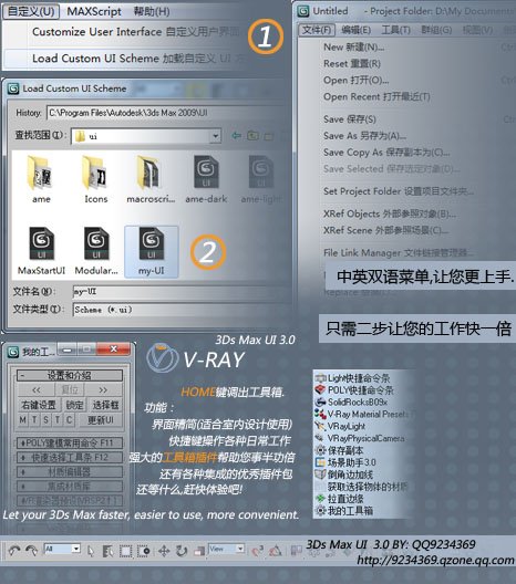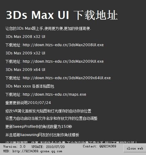 说明:因为我不是这个插件的编写者,而且对编程一无所知,所以很多问题无法解答~只能将我碰到的一些问题的解决办法说明一下~ 首先,如果有功能无法使用,请检查版本是否对应,该插件只包含MAX2008与2009版本,暂无2010版本,另还要看下是否安装.net framework 3.5 SP1 ~该插件很多内容用需要这个支持~ 其次:该插件不包含Vray渲染器,所以没有安装Vray的朋友将无法使用材质库,可在电驴上找一个下载安装~ 第三:安装插件后,会造成界面变化跟快捷键更换,如想换回原版界面,可在 菜单--Customize(自定义)--Load Custom UI Scheme(载入自定义UI),然后在你的Max安装路径下面找到一个叫做UI的文件夹(如本人D:\Program Files\Autodesk\3ds Max 2009\ui\)--找到DefaultUI.ui就可以了~ 快捷键的恢复:菜单--Customize(自定义)--Customize User Interface(自定义用户界面)--Keyboard--点击Reset改回max默认快捷键,或者使用Load载入你个人的快捷键(如我使用的是水晶石快捷键) 补充,该软件有一个交流QQ群 51167964 ,群主就是原作者,大家可以加入群,向“会飞的猪く”提问或反映BUG~谢谢 最后感谢大家的支持,希望大家能够共同进步~更上一层楼~