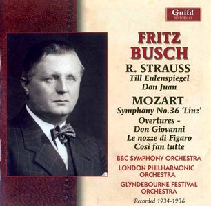 :   1929年12月4日,Fritz Busch在伦敦Queen's Hall指挥Brahms的小提琴协奏曲,与伦敦交响乐团和年轻才子Menuhin一起,第一次与伦敦的乐团合作。然而,除了Fritz Busch在1934-1936年间在Glyndebourne的录音外,其他在伦敦的录音是极其罕见的。   Fritz Busch自1933年3月7日就任Dresden Opera的音乐总指挥后,由于政治原因,他很想离开纳粹德国。八月,布宜诺斯的Teatro Colon发出邀请,只可惜家人还未准备妥当。当他打算带着妻儿离开时,两个小女儿还是在校学生,接受着正统的教育。因此,Fritz把她们带到英格兰的一所公共女子学校。1933年5月10日,他带女儿来到伦敦与弟弟Adolf和弟媳Frieda会面,并出席了一场由Kussevitzky指挥的音乐会,之后又去意大利等地。直到1933年12月,Fritz才回伦敦,有过两次短暂的停留。   四个月后,也就是1934年3月5日和6日,Fritz Busch与Queen's Hall的乐团在4日留下了他杰出的录音。因为Fritz3月2日才抵达伦敦,所以没有太多排演的时间。但是,3月3日还是保留了两场共计5.5小时的排演。Mozart的C大调交响曲K. 425(又曰Linz交响曲,Fritz在1949年哥本哈根还有另一个录音,发行于同厂牌GHCD 2339)首先在3月5日录音,继而是Richard Strauss的Till Eulenspiegels lustige Streiche,Op. 28(《悌尔的恶作剧》)。Mozart交响曲拉开帷幕后,Adolf Busch的Mozart变奏曲和Beethoven的第四交响曲随之上演,Strauss的作品没有在音乐会上演出。   完成了一些在阿姆斯特丹、都灵和哥本哈根的事宜后,Busch速速赶回英国,参加5月28日重要的第一届Glyndebourne音乐会。他将以Le nozze di Figaro作为开场戏,接着还有Così fan tutte。很快地,第一份Le nozze di Figaro的商业录音开始了,但这个录音一年后才最终制作完成。这些Mozart歌剧首次室内录音的重要意义,时至今日仍可见一斑。(Così fan tutte和Don Giovanni分别在1935年和1936年录制。在给弟弟的一封信里,Busch说,1935年他录了“整整5个早上,180多份带子”。)作为音乐指挥大师的Busch,一直是Glyndebourne里影响极大的几个人物之一。至少到上世纪80年代,曾任其助理的Sir John Pritchard还指挥了许多Mozart作品。   在布宜诺斯度过夏季后,Busch于1934年12月抵达伦敦,1935年5月回到Glyndebourne。这次音乐会包含了Così fan tutte,Die Zauberflöte,Le nozze di Figaro和Die Entführung aus dem Serail。所有这些演出,包括后来的Don Giovanni,都由Busch的好友Carl Ebert指导(两人在1932年柏林的Ballo in Maschera就已经合作过)。1936年5月3日,Busch回到Glyndebourne,开幕式在5月20日。Busch的排演很成功,直到6日的演出也得到一致好评。从6月29日到7月5日,下午演出的同时,Busch还在录制Don Giovanni的唱片。唱片上出演的Glyndebourne Festival Orchestra大体上由London Symphony Orchestra的成员组成。音乐会刚刚结束,Busch录制了Mozart的Don Giovanni和Richard Strauss的Don Juan,这次没有和BBC Symphony Orchestra而是与London Philharmonic Orchestra合作。实际上,后者也充当了后来几十年的Glyndebourne Festival Orchestra。Fritz Busch的行程很匆忙。正如他的日记所写,7月10日的Busch已身处S.S. Argentina,正在返回南美的路上。   Busch在第一次录制Mozart交响曲的三个乐章时(除小步舞曲没有重复外,其余都有),十分注意Mozart在衔接上的本意,同时用了许多滑音,急板终曲更是力量与活力的完满体现。两个Strauss的作品表现得似乎更加活力四射(遗憾的是,除了1923年Der Bürger als Edelmann和1928年Die ägyptische Helena的一些片段外,Busch只留下Strauss的管弦乐录音)。早在童年,Busch便爱上Strauss式的诗歌。而且,在德累斯顿,他初次公演的也是Intermezzo和Die ägyptische Helena(与德累斯顿歌剧院指挥Dr. Alfred Reucker合作)。当然,Thomas Beecham的London Philhamonic Orchestra和Adrian Boult的BBC Symphony Orchestra也拥有非凡的水准,为Fritz Busch钟爱的两部Strauss作品带来闪亮的色彩。(文字转自我的豆瓣日志