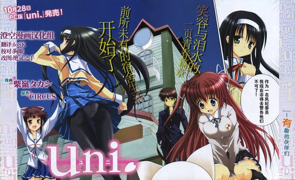 【简介】 行端正,学习优秀的女孩子・星空绮丽々(ほしぞらきらら)有个烦恼。——那就是自己的名字。「是个可爱的名字呀」虽然也有朋友是这样赞美,但大多数的同班同学都肯定是认为是「古怪的名字」的。绮丽々怨恨原本是暴走族的父亲。「真想快点离开父母身边,独立一个人住……不良和暴走族什么的都给我消失就好了……那么也就不会再有人和我一样有这种悔恨了……」绮丽々升上了风见学园本校,但却毫无因为新生活受到鼓舞的心情。一想到每年每年拷问似的新班级自我介绍,心情低沉地在走廊走着,在那里贴有一古怪的新闻引起她的注意。——初音岛学生风纪联盟寻求个人加盟者—— 『正义感强烈的您! 想要和美好的伙伴一起守护初音岛的风纪吗?』女性1名有带浴室・厕所的专用宿舍—— 「就、就是这个了!」绮丽々跑向了古怪新闻上所写的地址。 【角色介绍】 秋月 帆佳   总是在发呆,呆头呆脑的女孩子秋月 帆佳 (あきつき ほのか)   身高:155cm 罩杯:F CUP   喜欢:章鱼先生、煎蛋汉堡肉饼、宇宙、旧世代游戏(Retro game)    讨厌:优柔寡断的自己   胸部很大,常受到异性的注目。   因为她本人没什么意识到男人的视线所看起来毫无警戒心。   虽然最喜欢章鱼先生的,但因太优柔寡断而不知不觉地买了墨鱼先生的商品。 喜多 恵実   开朗有活力,还留有孩子气一面的女孩子喜多 恵実 (きた めぐみ)   身高:150cm 罩杯:B CUP   喜欢:所有占卜 讨厌:酸梅干   总是带着会说话的人偶“まりりん”,常表演2人相声似的对话。   以命中率很高为豪的塔罗牌占卜是她的特技,但不知为什么存在感薄弱,薄弱到除了住在宿舍内的人以外都对她无所认识。 星空 绮丽々   拼命守护风纪,加入了初音岛学生风纪联盟的少女。星空 绮丽々 (ほしぞら きらら)   身高:160cm 罩杯:C CUP   喜欢:风纪、规律、常识 讨厌:不良、暴走族、脱离常识、动物 (其实是喜欢)   认真严肃得过分,耿直的人,不晓得变通的性格,认为异性交往是成为不良的开端。   自己绝对不会说出来(但已经露馅了),她非常喜欢甜食和可爱的动物。   可不知为什么动物们都不亲近绮丽々,所以她本人就说是「讨厌动物」。 早乙女 リルカ   讨厌男人的毒舌女孩子。早乙女 リルカ (さおとめ りるか)   身高:152cm 罩杯:B CUP   喜欢:布偶 讨厌:菠萝、青椒、胡萝卜   最喜欢绮丽々了,有些爱慕过剩。   在怪人众多的桜刻馆中是少数负责吐槽的角色。   特技是自力学会的“踵落とし”(空手道中的一种上段踢技)。 白河 いおり   腼腆的初音岛偶像。白河 いおり (しらかわ いおり)   身高:158cm 罩杯:D CUP   喜欢:咏唱短歌、打扫 讨厌:碳酸饮料、受瞩目   头脑清晰,运动神经也是顶尖的。   容姿超群漂亮。   因此在学生中受到不论男女都向她投向的仰慕的眼神。   但她本人总是先害羞起来,似乎是不怎么为此而高兴。 クラリッサ   任性傲慢,从德国来的大小姐留学生。クラリッサ・フォン・リヒトホーフェン 身高:158cm 罩杯:C CUP   喜欢:年轮蛋糕、被奉承 讨厌:比自己更受瞩目的人   自称魔法使。   擅长从自己手中变出年轮蛋糕的魔法。   以她的容姿自小受到不论男女老少的疼爱。   来到初音岛后,似乎是对比自己还要受欢迎的白河いおり此人的存在感到不满。 橘 薫子   风见学园的新任教师橘 薫子 (たちばな かおるこ)   身高:160cm 罩杯:E CUP   喜欢:读书 讨厌:早起   年龄相近所以女子学生间的玩笑也通晓,还有对男子学生有温柔体贴的包容力使她似乎有着大人气。   可在宿舍里就是露出懒散的一面。   虽然自认还是很年轻的,但却跟不上宿舍成员的活力,常常让她感到年龄的差别。 【作品信息】 ■漫画名:Uni. ■发行日期: 2010年10月 ■文字: 简体中文 【澄空漫画汉化组】(参与本篇作品的) 翻译:开关(IoSK) 校对:狗眼 改图:小手(绝灵之手),櫻嵐 【官方网站】 澄空学园:http://bbs.sumisora.com/