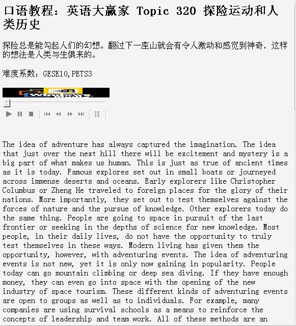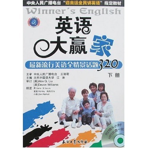《英语大赢家:最新流行美语全情景话题320》被选为中央人民广播电台黄金栏目“阳光英语”迎奥运全民讲英语指定教材,于2007年7月16日每天早6:40—7:00以同名节目“迎奥运全民讲英语”——《英语大赢家》同期播讲,该节目将历时1年,掀起迎接奥运全民英语学习的一个高潮。 《英语大赢家:最新流行美语全情景话题320》是英语专家在分析调研了数万份不同水平段的调查问卷后,结合中国人讲英语的实际需求,考虑了中国人学习英语的实际软肋,吸收了美国专家的建议而编写的,力求“止国人之渴”;经由中外老师联合办公,不间断交流,充分借鉴吸收各类媒体素材,共同编写。力求“引正本之源”;再由美国若干普通家庭现场朗读后,提出修改意见,力求“显大众之本色”;随后由中国老师为主,根据中国学生的认知特点设计编写练习,力求“投学生所好”;最后由中外专家互相审定而成,力求“归学术之路”。