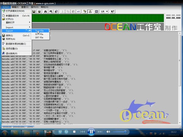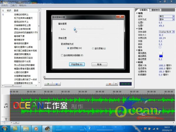 - OCEAN工作室录制(www.o-gzs.com 会声会影制作卡拉OK字幕图文教程 准备工作: 1.小灰熊字幕制作软件或Lrc歌词编辑器软件:用来将Lrc歌词转化成Text文本文档 2.sayatoo卡拉字幕精灵:制作kaj字幕 3.会声会影:制作MTV 具体步骤: 1.将您制作MTV所需要的歌曲和Lrc歌词下载到本地 该操作比较简单,不再详细讲解 2.将Lrc歌词转化为Text文本(下边以小灰熊软件为例) ①导入Lrc歌词:「文件」→「Import」→「LRC File」,在弹出的对话框中选择自己提前准备的Lrc歌词 ②直接将歌词输出为Text文本 3.使用Sayatoo卡拉字幕精灵制作kaj字幕 ①打开Sayatoo卡拉字幕精灵,导入上一步导出的Text文本歌词和歌曲:「文件」→「导入歌词」;「文件」→「导入音乐」 导入之后的效果图如下: ②单击录制歌词按钮,设置歌词录制参数 在这里您可以设置歌曲的播放速度,慢放将有助于您更准确的录制歌词 勾选逐字录制和自动填满字间间距,点击开始录制按钮,录制歌词 ②直接将歌词输出为Text文本 开始录制歌词时,可以使用键盘或者鼠标来记录歌词的时间信息。显示器窗口上显示的是当前正在录制的歌词的状态。 使用键盘:当歌曲演唱到当前歌词时,按下键盘上任意键记录下该歌词的开始时间;当该歌词演唱结束后,松开按键记录下歌词的结束时间。按下到松开按键之间的时间间隔为歌词的持续时间。 使用鼠标:录制过程也可以通过用鼠标点击控制台上的按钮来记录歌词时间。按下按钮记录下歌词的开始时间,弹起按钮记录下歌词的结束时间。按下到弹起按钮之间的时间间隔为歌词的持续时间。 如果需要对某一行歌词重新进行录制,首先将时间线上指针移动到该行歌词开始演唱前的位置,然后在歌词列表中点击选择需要重新录制的歌词行,再点击控制台上的录制按钮对该行歌词进行录制。 歌词录制完成后,在时间线窗口上会显示出所有录制歌词的时间位置。你可以直接用鼠标修改歌词的开始时间和结束时间,或者移动歌词的位置。 在该字幕属性和模板特效面板,可对字幕进行进一步美化工作 ③导出kaj字幕文件:「文件」→「保存项目」 4.在会声会影中导入kaj字幕文件 kaj字幕项目文件可以直接在Ulead VideoStudio(会声会影)中使用。kaj文件本身带有Alpha通道,将kaj文件当作视频文件打开并直接拖入时间线视窗的覆盖层轨道上,并且将图像拉大至满屏。然后将相应的音乐文件拖入音乐轨道并与kaj字幕文件对齐即可。 在Ulead VideoStudio中使用kaj文件的要求是: 1.安装Sayatoo卡拉字幕精灵 2.Ulead VideoStudio 8.0以上 3.在Ulead VideoStudio中已安装插件支持。 手动安装插件:将Sayatoo安装目录下的host目录中的uvKAJ.vio文件复制到Ulead VideoStudio安装目录下的VIO目录内 打开会声会影,将kaj字幕文件作为视频文件导入到会声会影即可 将kaj字幕文件插入到视频轨或覆迭轨即可完成字幕的插入 最终MTV的卡拉OK字幕效果 详细图文教程教程可登录:www.o-gzs.com