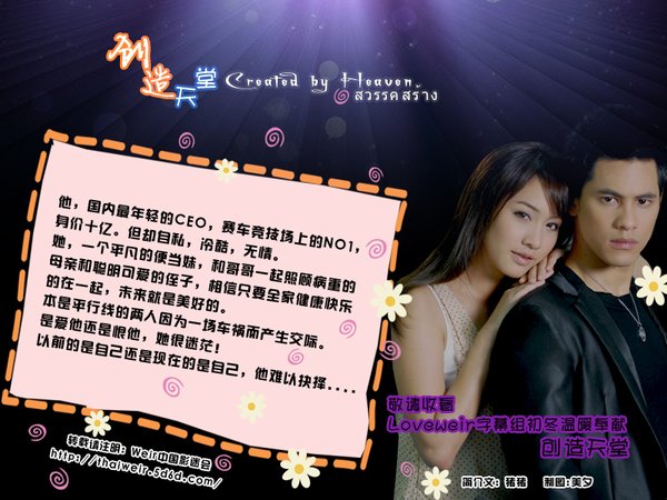 【剧  名】:创造天堂 【集  数】:12集 【年  份】:2010-09-01 【格  式】:Rmvb 【语  言】:泰语 【字  幕】:中字 【导  演】:不详 【主要演员】: Cee Siwat .... Nakrope Payakracha Min Pechaya .... Oun Jai Chain Nattawat .... Nakkid Gunjae-Sal Parntong .... Dokjun Sirakoop Methanee .... Jormpope Muay Supreeda .... Khun Ying Nayika Jieb Chompoonuch .... Susie Golf Anuwat .... Jormthep Ware Soul .... Nimmarn Note Watcharabul .... Tongtew 【内容简介】:   在摩托车竞技场上,一位玉树临风的车手站在那里,刺激危险的游戏是他的快乐源泉。车手帕亚拉喳(siwad chodchaicharin)成功地越过火堆和所有障碍物,场边时尚的人群都欢呼着,所有美女都蜂拥进赛场,只为得到车手的青睐……