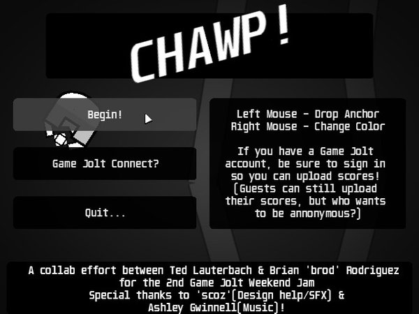------------------ CHAWP! v0.9.9 A game by Ted Lauterbach Brian 'brod' Rodriguez for GameJolt's GameJam ------------------ Controls ------------------ Left Click (Hold) - Place Anchor Left Click (Release) - Chawp! Right Click - change Color Notes ------------------ UNZIP THE GAME FOLDER AND ITS CONTENTS OR THE GAME WILL NOT RUN PROPERLY. Support ------------------ If you have any questions regarding performance, use, or promotion of this video game, please direct them towards: ted.lauterbach@gmail.com