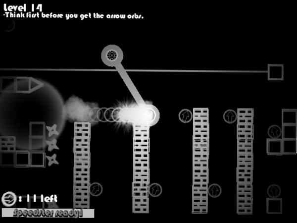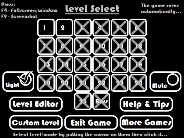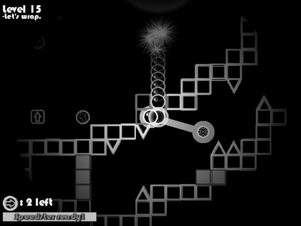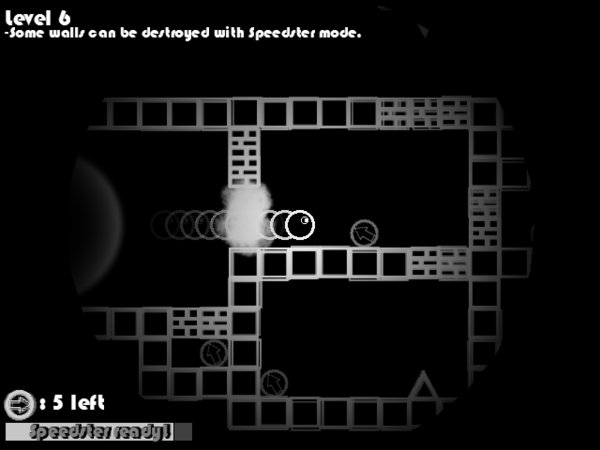 方向键控制,当左下角的进度条载入完毕之后,就可以使用加速了,按住空格,选择一个方向,圆圈就会冲刺过去,直到碰到墙壁才会停下来。就不废话,看视频演示。一共 25 + Boss 关。不过瘾的话,可以自行编辑关卡。