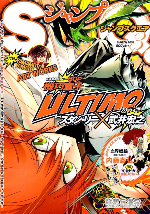 【作品情报】 漫画名:机巧童子ULTIMO 出版社:集英社 类 型:SF 连载杂誌:少年JUMPSQ 连载期间 2009年3月号 - 连载中 册 数:6 【内容介绍】 完全的"善"和完全的"恶",旦斯坦博士留下的这两具带着人心两个极端的力量的"机巧童子",会给世界带来什么样的异变呢?"通灵王"作者武井宏之老师在沉寂多时之后,如今携手美国"蜘蛛侠"漫画作者STAN LEE,全新创作这部作品,东西方创作文化的融合将会带给我们全新的感受,故事的发展也十分值得期待! 《机巧童子 ULTIMO》于今年4月18日在日本发售的《增刊JUMP SQII》上刊载,由于作品系由Stan Lee原作、武井宏之作画的形式推出,故一度成为了话题。本作讲述机器人之间的斗争,主题为“绝对的善VS绝对的恶”,这已是美国漫画的常规套路,将美国式超级英雄漫画的世界观融合上日式画风,就构成了本作。 Stan Lee是美国漫画巨匠,曾创作多部脍炙人口的漫画,大家熟悉的就有《蜘蛛侠》、《X-MAN》等,在美国漫画界的地位好比手豕治虫之于日本漫画界。 另一方面,武井宏之虽是日本本土漫画家兼插画家,但在日本的知名度不大,反而他的作品在美国受到了好评。他的作品不多,有《佛Zone》、《通灵王》等。