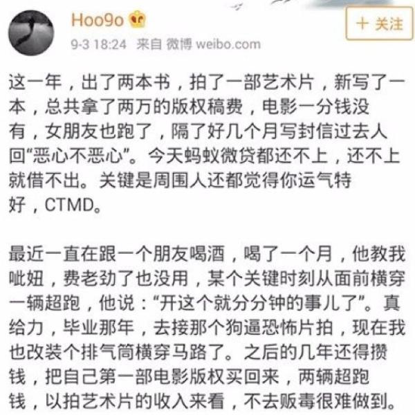 除了电影的问题,贫穷潦倒,女友离去也是压垮胡波的原因。除了导演,胡波还有一个作家的身份,出版过《牛蛙》、《大裂》两本小说。《大象席地而坐》中的故事也是根据自己的小说改编而来。但微薄的稿费并不足以支撑他的生活。