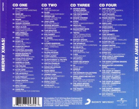 引用 “ With 80 tracks across 4CDs, this compilation perfectly captures the sentiment of the season with evergreens from Mariah Carey, Wham!, Slade, Sir Cliff Richard, East 17, Andy Williams, Chris Rea, Brenda Lee, Frankie Goes To Hollywood, Bing Crosby, Frank Sinatra, The Jackson 5 and Band Aid. Furthermore, this album is brought up to date with new singles from contemporary pop's finest; including Lady GaGa, The Pussycat Dolls, Girls Aloud and George Michael – here with his 2009 hit 'December Song.' In addition to all the classic Xmas pop hits, also included are a clutch of festive carols such as 'Ding Dong Merrily On High' and 'O Come All Ye Faithful!,' alongside beautiful classical-opera tracks from Charlotte Church, Il Divo, G4 and The Priests. ”