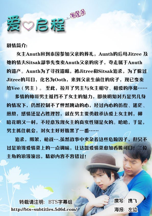 【剧  名】:爱起程 【集  数】:29集 【年  份】:2010 【格  式】:Rmvb 【语  言】:泰语 【字  幕】:中字 【导  演】:不详 【主要演员】: Bie Sukrit .... Pattahvee Vill Wannarot .... Ood/Anuth Fang Pitchaya .... Janejira Toey Jarinporn .... Patcha Oh Anuchit .... Thanh Panward Hammanee .... Jitree Karnjana Jindawat .... Nuanjan(Vee的妈妈) Ann Alicha .... Na姐 【内容简介】:
