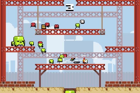 另类稍变态的平台游戏。得分的高低不是杀死敌人的多少,而是能收集到多少个包装箱。每收集一个包装箱,武器就会更换一次。方向键控制,Z 跳跃(上方向键也可以跳跃),X 开火。敌人会从上面掉下来,如果敌人冲到最后,掉到火坑里,它会变强,并从上面下来。