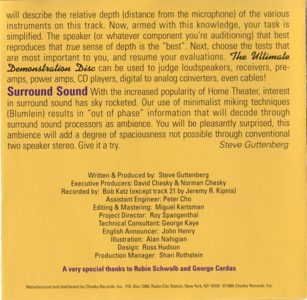 这张"终级音响测试天尊"是Chesky与全球发烧友和音乐爱好者分享该厂努力的成果。是市面上唯一能让聆者在65分钟之内立刻洞悉音响上的分辨率、深度、动态、中音清纯度、临场感、冲击感、透明度、空间感等专业技巧有声工具书。