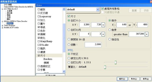 FFDShow可以称得上是全能的解码、编码器。最初FFDShow只是MPEG视频解码器,不过现在他能做到的远不止于此,它能够解码的视频格式已经远远超出了MPEG4的范围。同时,它也提供了丰富的加工处理选项,可以锐化画面,调节画面的亮度等等。不止是视频,FFDShow现在同样可以解码音频,AC3、MP3等音频格式都可支持。可以说现在的FFDShow已经是Windows平台多媒体播放的非常出色的工具了。