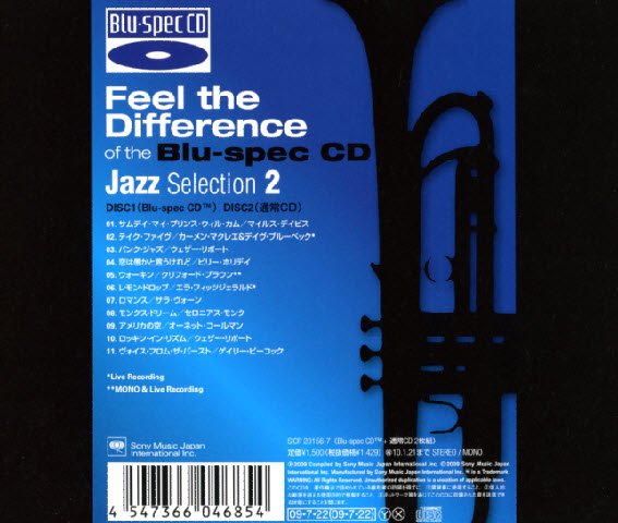 : 怎么说呢。。。Sony Music Entertainment 在 2009 应用了蓝光光碟的素材和制造技术而制造的高品质CD,可以用现有CD播放器播放。虽我们大多数人的听力都不太可能像Karajan那样厉害,但应还是能分辨出细微的不同,正如专辑所言那样,“一起来比较看看吧!” (Feel the Difference...) 这里发布的当然只是CD版本的Jazz Selection 2。2 意指CD版和Blu-Spec CD版 双CD; 俩张CD同步发行以方便比较,很有较劲的味道 ! 这张专辑收集了 Miles Davis, Carmen McRae, Weather Report, Billie Holiday, Clifford Brown, Ella Fitzgerald 等大师的作品,应是喜欢 Jazz 的朋友不可错过的吧 。。