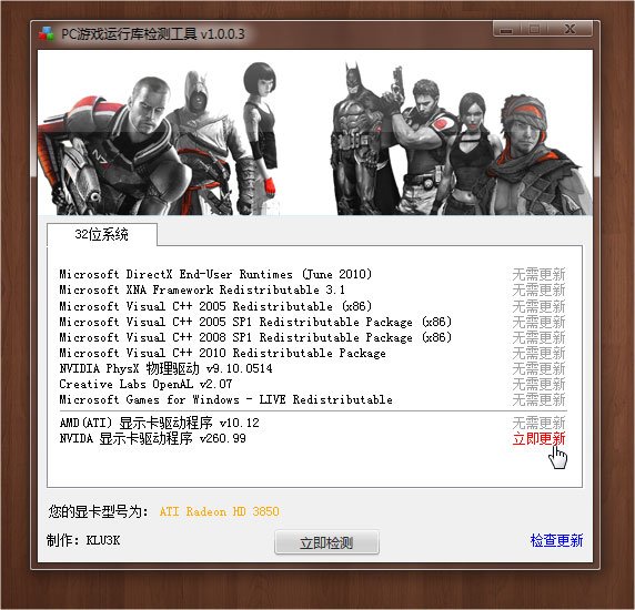 说明:(by. KLU3K) ※ 声明: 1. 本工具是原创软件,转载请注明。 2. 本工具使用Autoit3 编写,部分杀毒软件会报告有病毒请自己先查杀一下,不放心的可以放弃使用!   在线查毒http://www.virustotal.com/ 或 http://www.virscan.org/ 3. 仅在Win7下测试,XP应该也没问题,有问题欢迎跟帖反应。 ※ 使用说明 1. 下载后放入任何文件夹内运行,无需安装,绿色无广告。 2. 该工具作用就是检测当前计算机中是否安装了必要的游戏运行库,避免游戏出现各种错误问题或无法运行等问题。 3. 如果检测到没有安装或版本较低,则会出现红字,点击【立即更新】即可跳转至下载页面或直接下载地址。 4. 条件有限,我是A卡,N卡目前暂时无法准确检测版本驱动号,希望有朋友能帮忙给个方法检测当前计算机安装的驱动号。 5. 本工具尚未完全做好,条件非常有限,64位目前尚未制作,有空我会继续更新直到所有功能全部开启。 6. 希望大家能多顶帖子,帮助初学者尽快解决他们的基础问题。顶贴只是举手之劳,让更多的人看到。 7. 本工具的准确性也因为条件问题没办法很详细的测试,如有问题,请回帖反应,说明详细情况。我有空就会改进。 8. 理论上说,如果全部无需更新,那么你的游戏应该是不会出错或无法运行的。 ※ 更新内容 2011年1月10日00:46:25 发布版:v1.0.0.0 最初版 2011年1月10日12:12:00 更新至:v1.0.0.1 增加显卡驱动的检测 2011年1月10日17:53:19 更新至:v1.0.0.2 修正Bug 2011年1月10日20:31:03 更新至:v1.0.0.3 修改显卡的检测文件 2011年1月10日21:42:19 更新至:v1.0.0.4 增加显卡识别