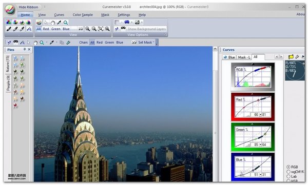 Curvesmeister是Photoshop中非常重要的Curve命令的延伸应用,软件更改了命令的执行界面,更加专业,还可以同时看到图片的所有颜色通道的曲线波形。