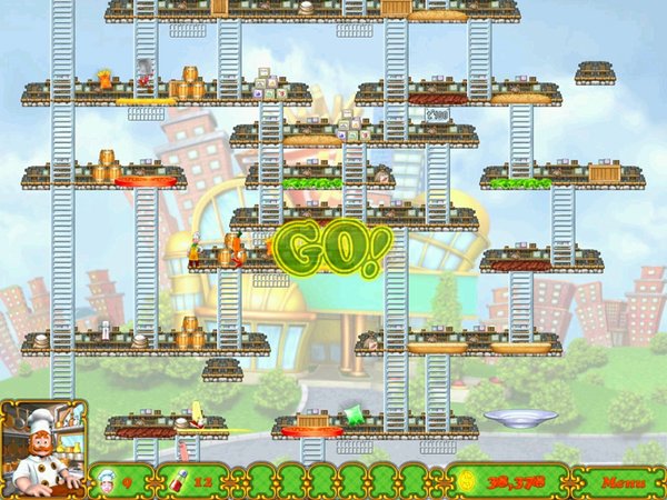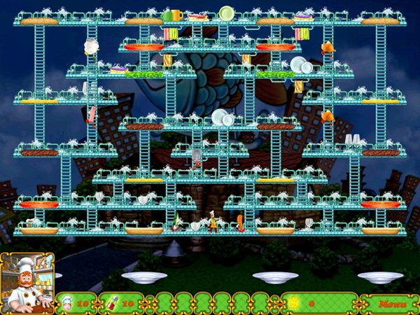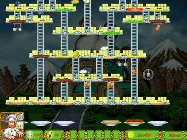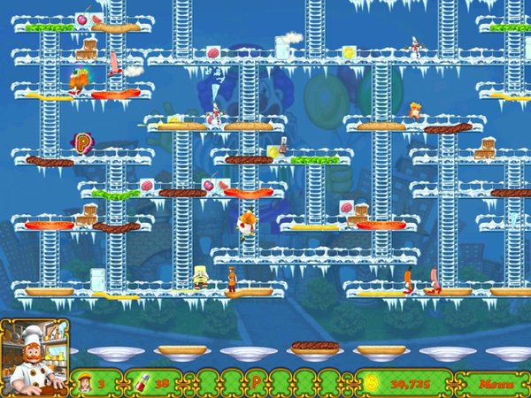 在这款休闲动作游戏《BurgerTime Deluxe》中,玩家需要去阻止厨房中的恶作剧,并通过踩踏材料的方式去制作汉堡。红萝卜,火腿肠,煎蛋等食材都会为你的制作带来困扰,快拿起你手中的利器—胡椒粉,去对付它们吧。 Let the culinary capers commence as Namco serves up BurgerTime Deluxe for PC! Enjoy a full course in Story Mode, or just sit down for a light snack in Quick Mode. Use your assortment of ingredients to thwart the dastardly Vinnie Vinegar. Scale the platforms and assemble the burgers to clear the levels. Daze baddies with pepper or earn big points by squashing them with falling ingredients! Buy the full version today or download the FREE trial! * Play through Story Mode or Quick Mode! * Thwart Vinnie Vinegar and the food baddies! * Over 60 delicious levels and minigames! * Tons of tasty powerups to use! How to Play Goal: Join Chefs Peter Pepper and Sally Salt as they help their uncle thwart the dastardly Vinnie Vinegar. Scale the platforms and assemble the burgers to clear the levels! Rules and Scoring: * Run over a burger piece in order to drop it to the level below. If it hits another piece, that piece will fall down a level as well. Complete each level by assembling all of the burgers. * Stun your enemies with your mighty pepper shaker * Get bonus points and lives by grabbing items: o 250 points - Potato Chips o 500 points - Ice-Cream Cone o 1000 points - A Cup of Coffee o 1250 points - Cup of Tea o Extra Life - French Fries * Grab special items to freeze, cook, or salt them to your tastes: o Ketchup Bottle - Kills all enemies on the map. o Salt Shaker - Stuns all enemies on the map. o Ice Cube - Player becomes invulnerable for a short time and will freeze any enemy touched. o Burning Cocktail - Player becomes invulnerable for a short time and will scorch any enemy touched. o Bubble - Player can blow a bubble and rise one level without a ladder. o Energy Drink - Player's speed temporarily increases. Mode: * Story Mode: Progress through the story mode and stop Vinnie Vinegar! * Quick Play: Play random levels until your lives run out! Controls: * Keyboard – Use the direction keys to move throughout the board. Press SPACEBAR to fire pepper shots. Hints & Tips: * Earn big points by squashing your edible adversaries with falling ingredients or dropping a piece out from under them! * Be patient. Stand on the far edge of a piece and wait for an enemy to get on, then drop him! * Start at the top of the level so the falling pieces bump down the ones below.