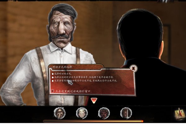 游戏在困难模式下采用对话选择的方式进行。针对不用的人玩家可以选择不同的对话态度,例如直接发问、友善、逼迫、魅惑等等。根据不同的选择会有不同的秘密被发现,大大增加了游戏的趣味性。选错了游戏的主线依然会正常进行,但发现不了每个人的秘密,这样可以考验你察言观色的能力。正常模式下没有多对话选择,直接进行主线故事。