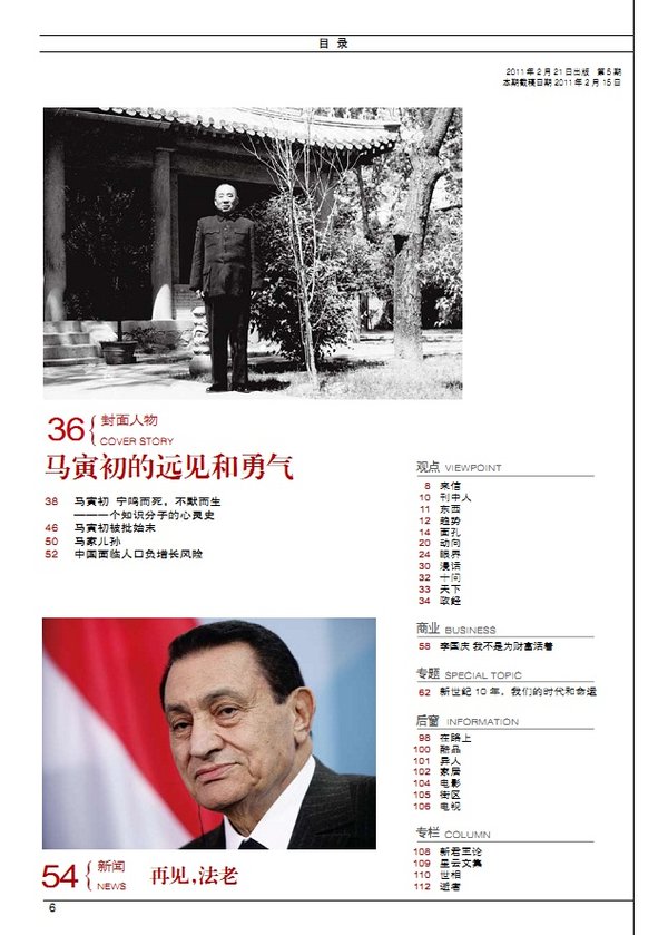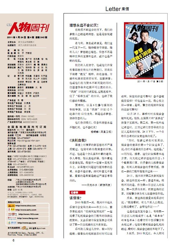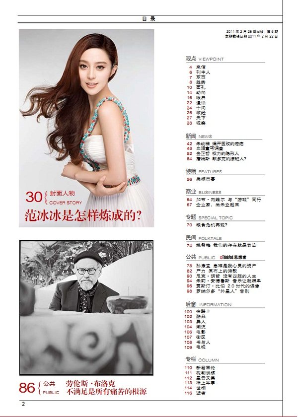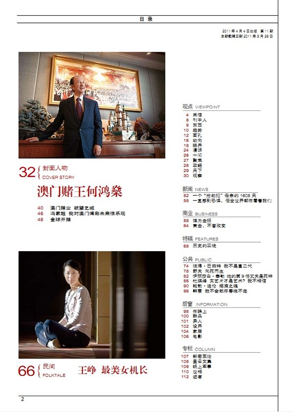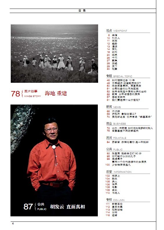 封面人物 30 梦想引领我们前进 32 拿什么守护我们的梦想 37 对贾樟柯要多点想象力 40 不努力,现实永远不会改变 44 造梦者在路上 50 我们尊重艺术家的创作自由 新闻 52 雷洁琼 曾经的斗士 终身的学者 56 白宫大换血 58 约翰·博纳 让眼泪飞 商业 68 徐文荣 横店帝国的幕后推手 71 “隐形财长”巴菲特霍金 公共 86 明星科学家是怎样炼成的 94 李健 在大时代的边上,浅唱