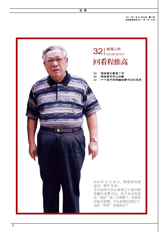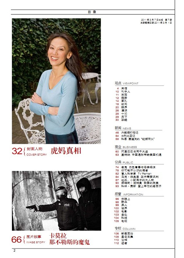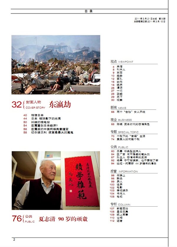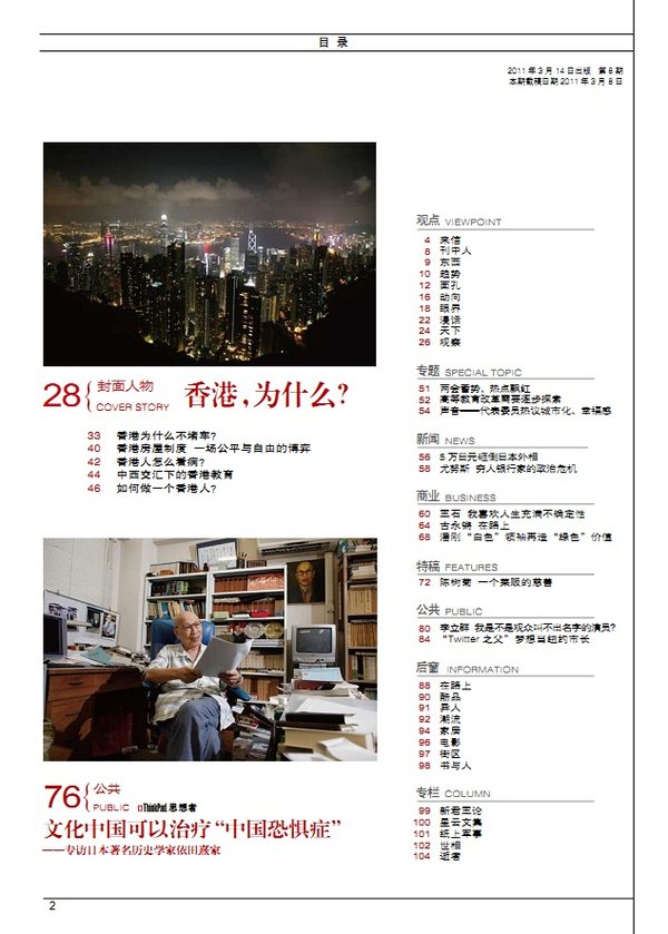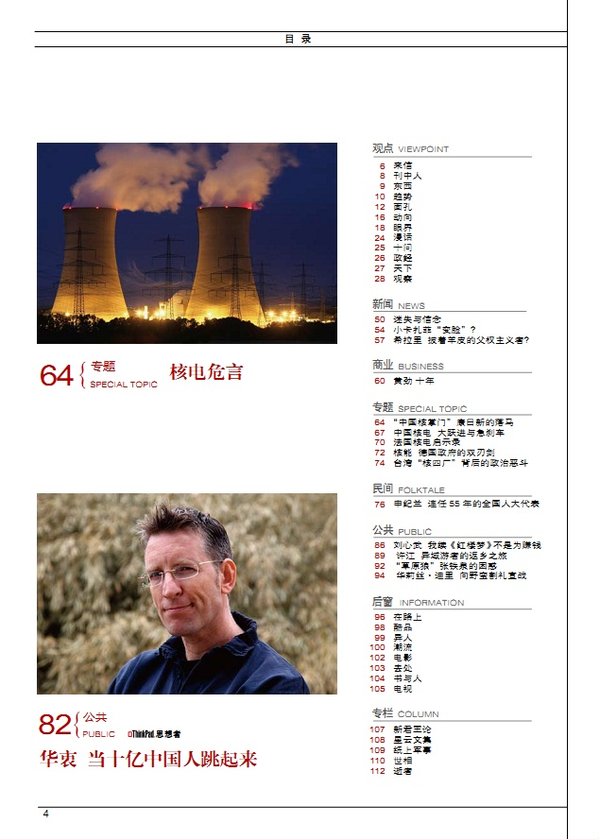 36 戈尔巴乔夫 成功者失败后的20年 新闻 56 中国应力避陷入东北亚冷战 59 理查森 八进朝鲜的“夺宝奇兵” 商业 62 中国像日本的 60年代末——访日本前央行副行长武藤敏郎 66 做最利于环境的改变——对话宝马大中华区总裁史登科博士 特稿 70 PK 民间 76 杨维骏 我跟大多数人站在一起 公共 80 杜赞奇 现代性之“恶”与民族主义的“毒” 87 拉里·金谢幕 90 李心洁 在我说愿意之前